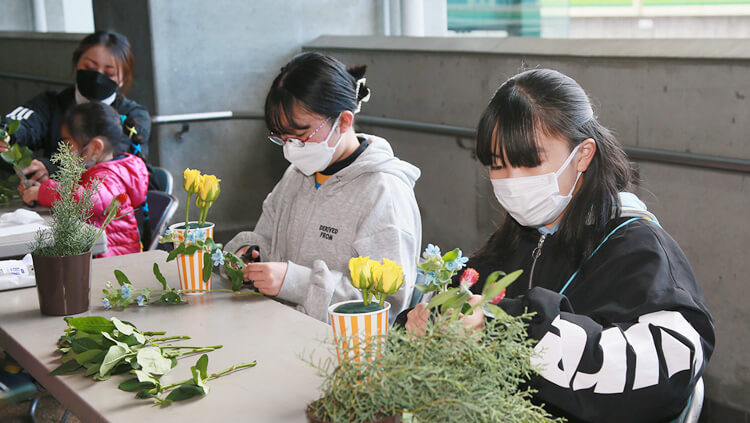 親子でフラワーアレンジメントを楽しんだ後には試合観戦はもちろん、作った応援花はコンコース内に展示いたします!マイナビカラーのフラワーアレンジメントで、ぜひ選手たちへの後押しをよろしくお願いします。