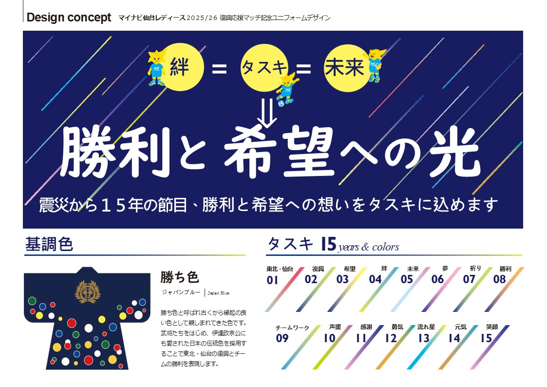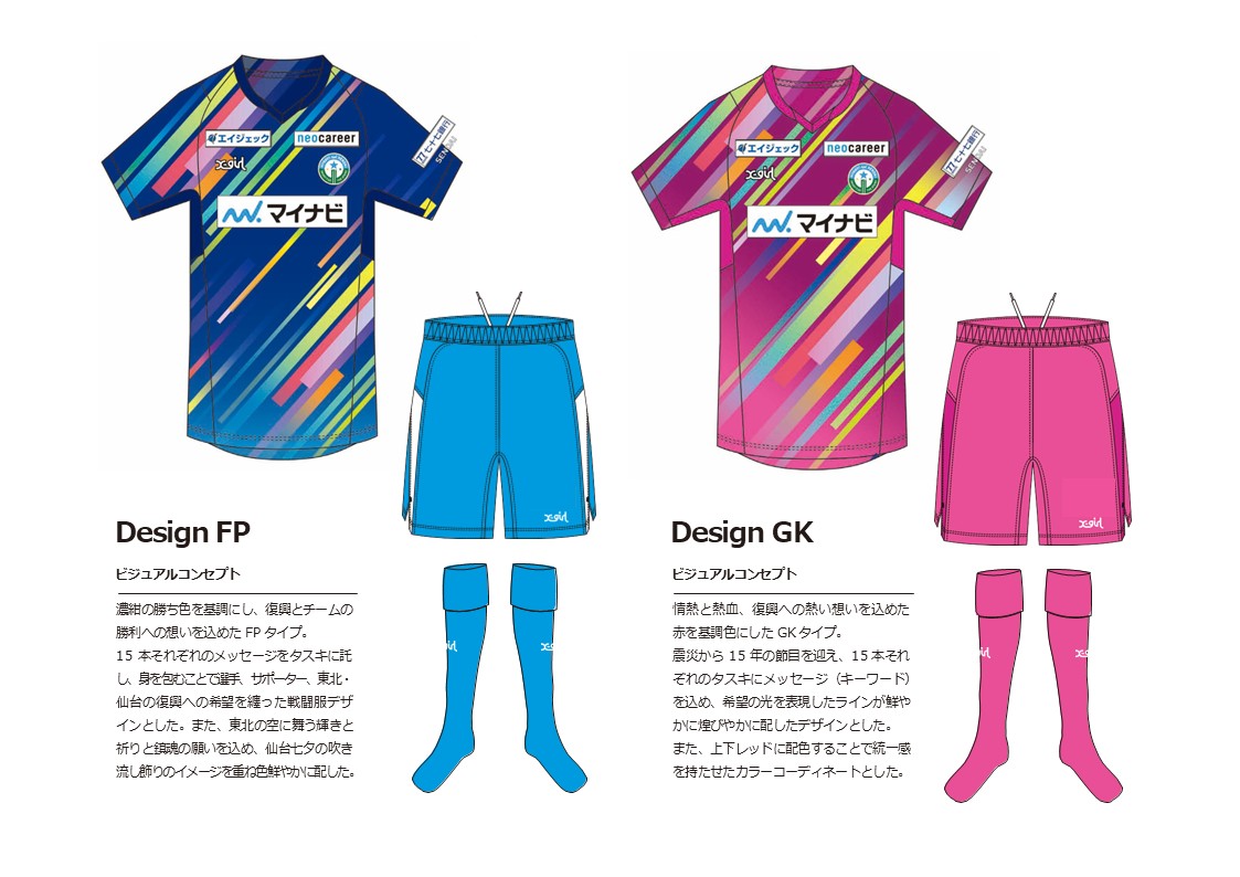 15 本それぞれのメッセージをタスキに託し、身を包むことで選手、サポーター、東北・仙台の復興への希望を纏った戦闘服デザインとした。また、東北の空に舞う輝きと祈りと鎮魂の願いを込め、仙台七夕の吹き流し飾りのイメージを重ね色鮮やかに配した。