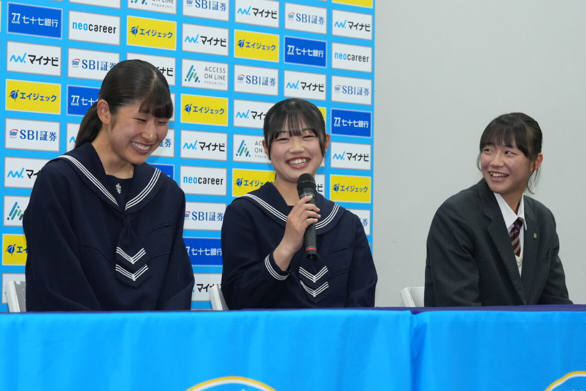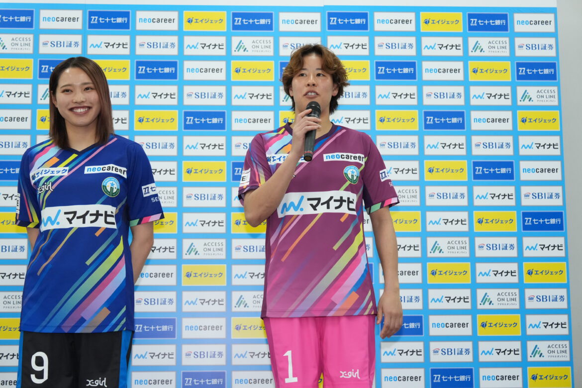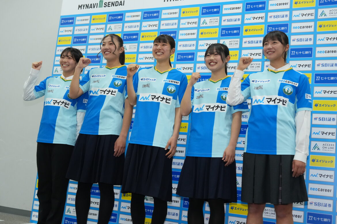 今回のデザインは、東北6県の学生のみなさまに参加いただき総数182の中から、学校法人北杜学園仙台青葉学院短期大学の小泉友功さんのデザインに決定いたしました。お披露目ではFW9廣澤真穂選手、GK1伊藤有里彩選手がモデルを務めました。