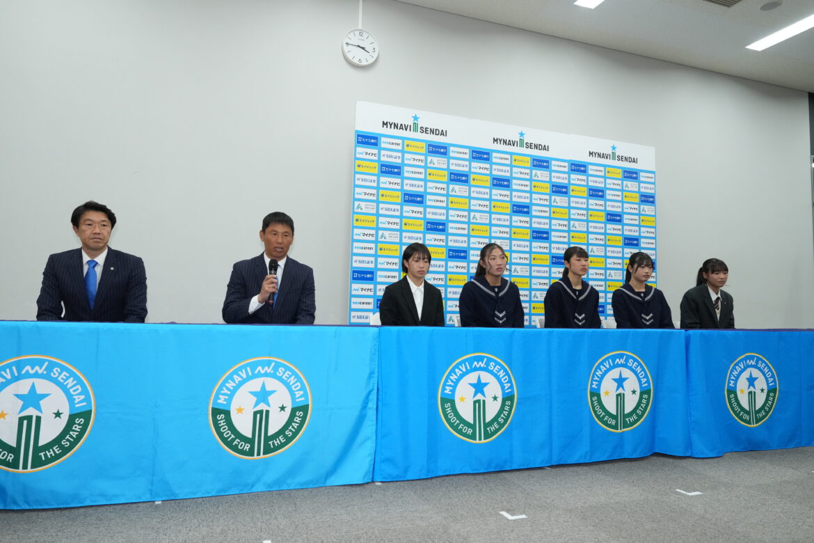 新加入選手記者会見には2月1日より正式加入した5選手(MF20篠田帆花選手、FW31津田愛乃音選手、DF32岩城恋音美選手、MF34菊地花奈選手、FW50松井美優選手)、山路嘉人 強化育成部部長、須永純監督が出席しました。