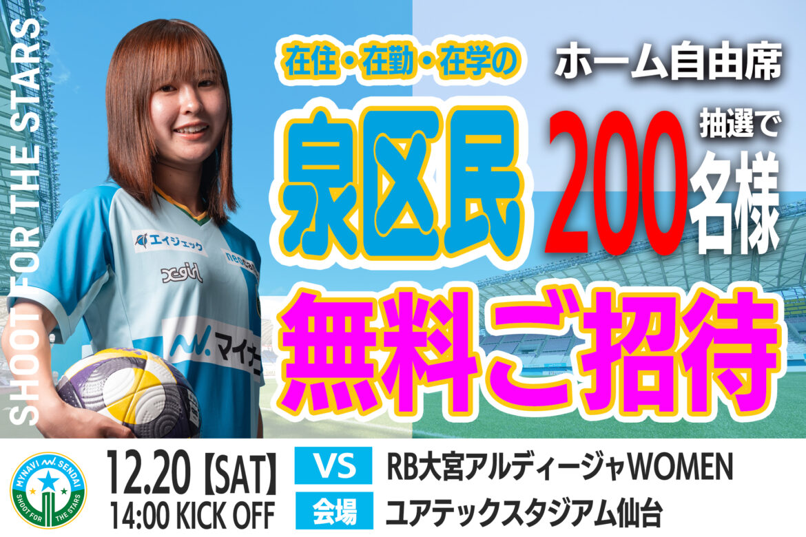 仙台市泉区・マイナビ仙台レディースホームタウン協議会のご協力のもと、泉区に在住・在勤・在学の方を対象に抽選で200名様をホームゲームにご招待いたします。